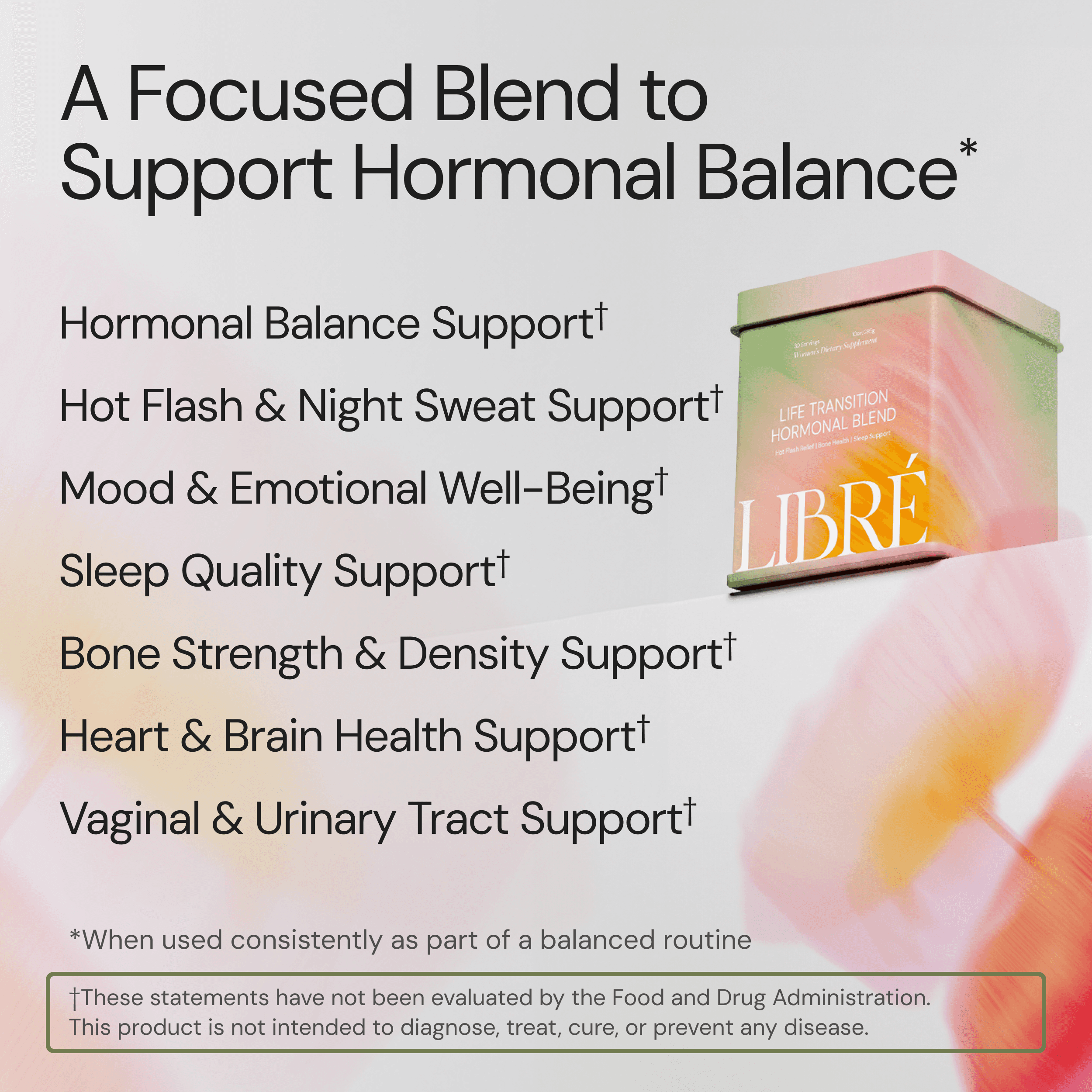 Life Transition Hormonal Blend is a targeted daily supplement designed to support women through the perimenopausal transitions. This formula focuses on hormonal balance, bone health, muscle function, gut and vaginal health, sleep support and overall vitality during a time of significant physiological & hormonal change.